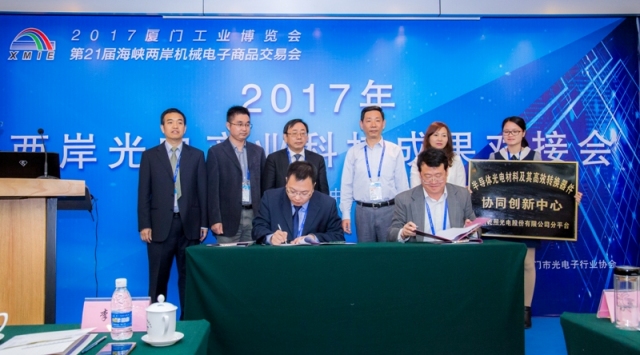 2017年413日,乾照光電總經理蔡海防先生出席了由廈門市科學技術局主辦,福建省光電行業協會、廈門市光電子行業協會等多家單位聯合承辦的“2017年兩岸光電產業科技成果對接會”,共同見證 “半導體光電材料及其高效轉換器件協同創新中心廈門乾照光電股份有限公司分平臺”的揭牌儀式,并代表公司與廈門大學簽署合作協議。此分平臺的設立,有利于提高公司與廈門大學之間的協同創新能力,不斷增強企業的技術創新能力,促進企業持續高速發展。