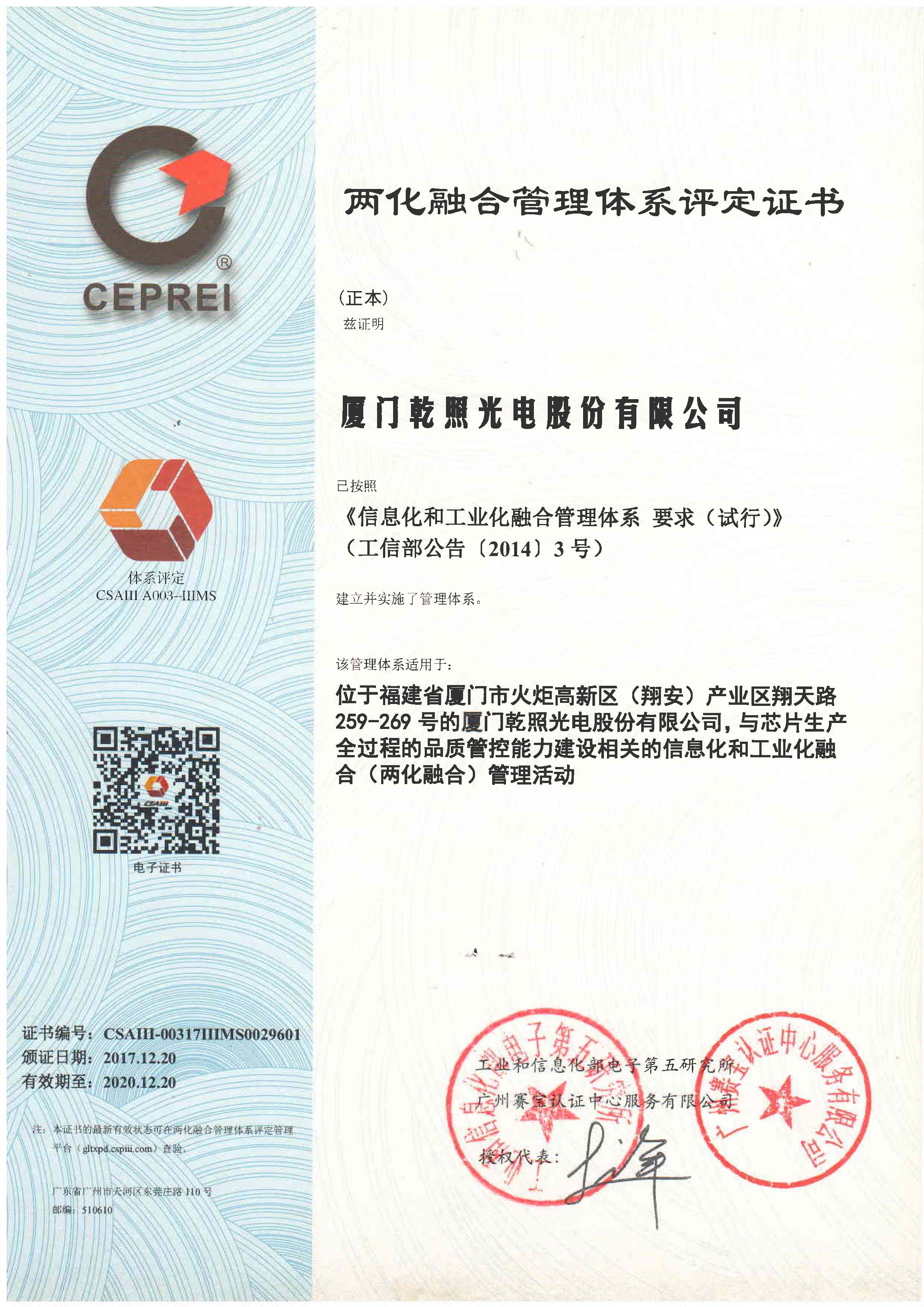 2017年12月20日,廈門乾照光電股份有限公司獲得兩化融合管理體系評定證書。這標志著乾照光電已建立起兩化融合管理體系,并在推進信息化和工業(yè)化深度融合方面取得顯著成效,在公司戰(zhàn)略轉型、組織變革、管理創(chuàng)新、技術融合和競爭力方面邁出堅實的一步。