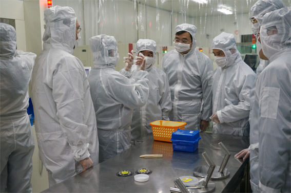 此次調研,我們陪同市委組織部的領導們參觀了芯片車間的工藝流程,并做了簡單的工藝介紹。為了能夠近距離的了解到我們的產品,在開發區管委會主任季允豐的陪下,同市委組織部部長張愛軍等一行6人便穿著無塵服前去外研車間近距離的觀察、了解我們的產品及性能介紹,并對我揚州乾照光電有限公司引進的高層次人才給予了高度的認可。