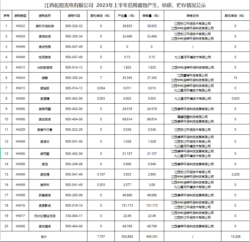 江西乾照光電有限公司2023年上半年危險廢物產(chǎn)生、轉(zhuǎn)移、貯存情況公示