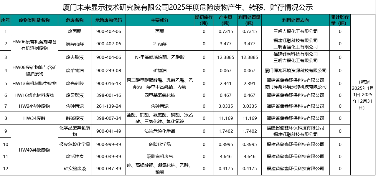 廈門未來顯示技術研究院有限公司2025年度危險廢物產生、轉移、貯存情況公示